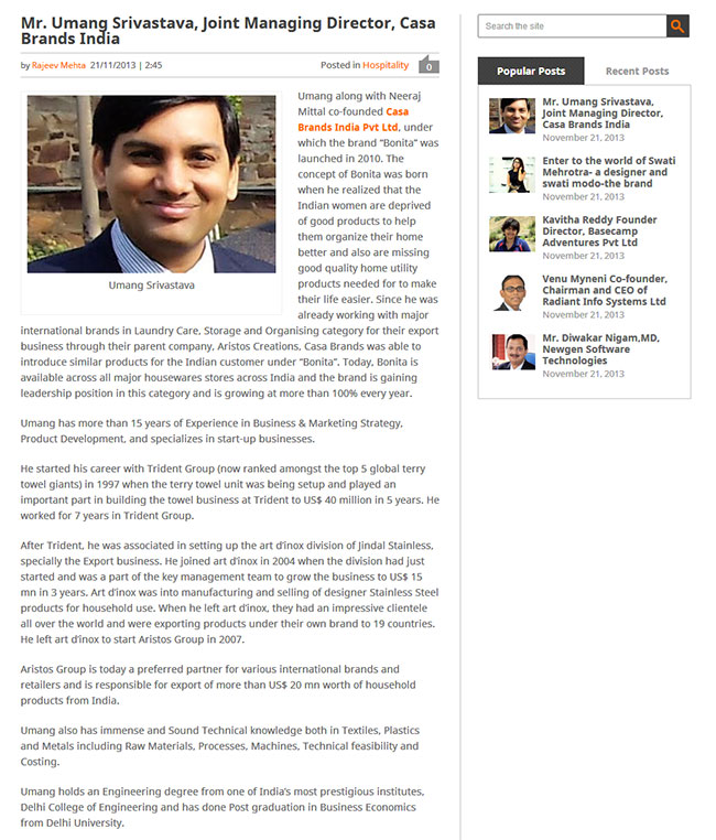 Mr. Umang Srivastava, Joint Managing Director, Casa Brands India (November 21st, 2013)